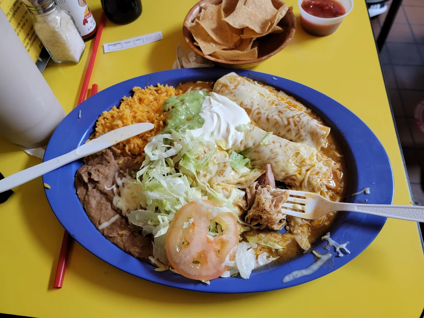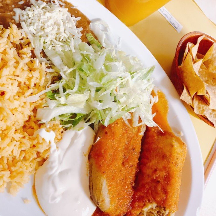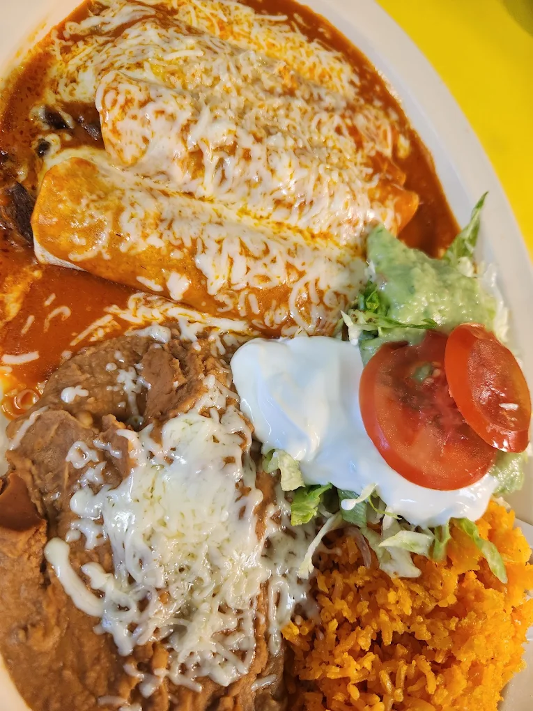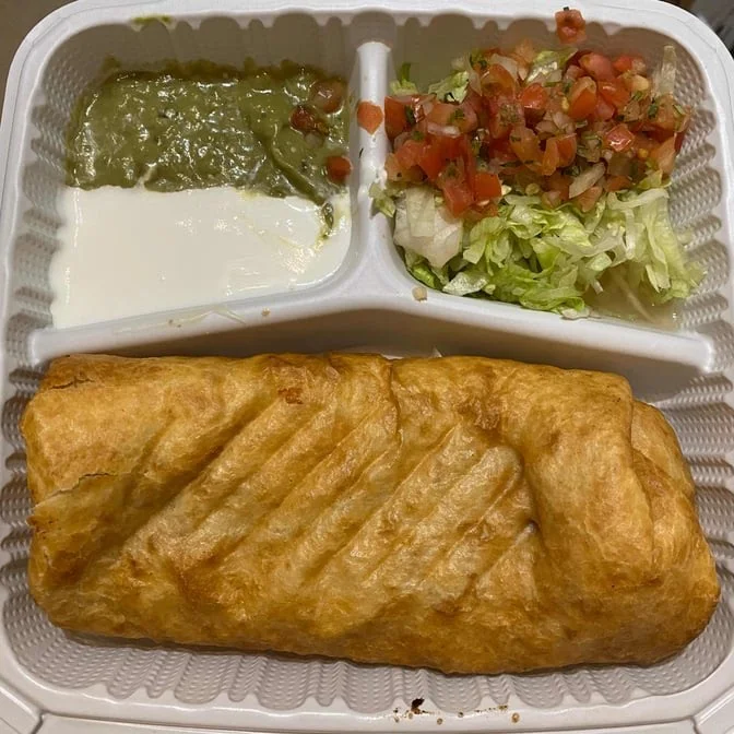 A Mountain View heavyweight. Huge flour tortilla stuffed with meat, rice, beans, and smothered in our house red sauce and melted cheese.